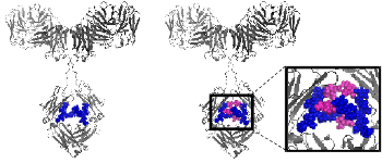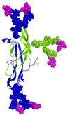 < Modeling of TSH structure. Alpha-subunit bears two N-glycans (in blue) and beta-subunit a single N-glycan (in green). Terminal sialic acid is represented in purple.